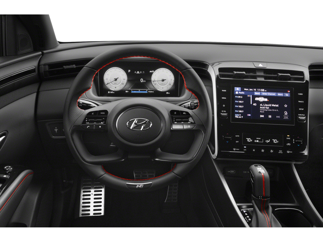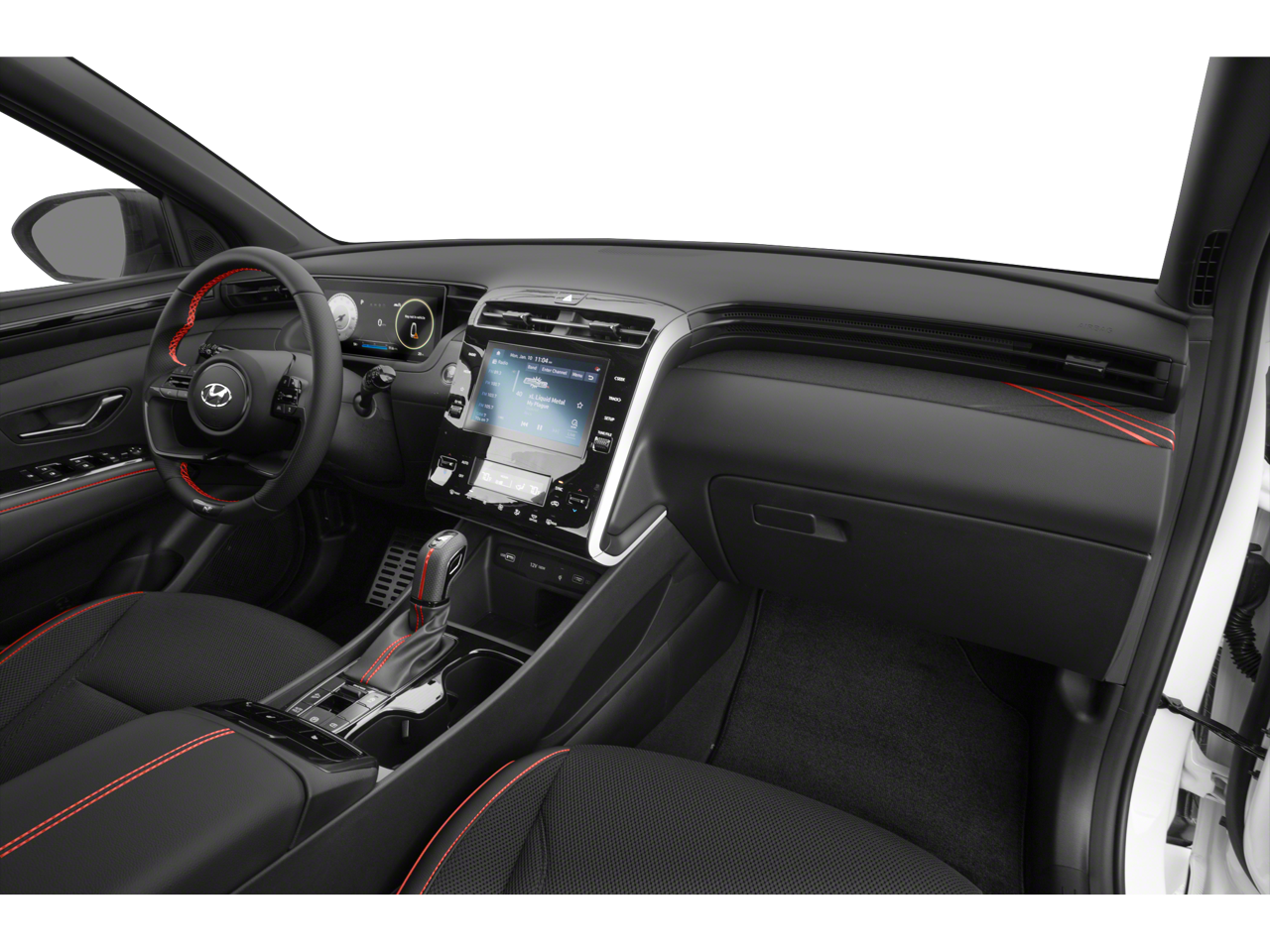 This Tucson N Line is nicely equipped with Cargo Package (Cargo Net, Cargo Tray, and First Aid Kit), Option Group 01, 3.648 Axle Ratio, 4-Wheel Disc Brakes, 8 Speakers, ABS brakes, Air Conditioning, Alloy wheels, AM/FM radio: SiriusXM, Apple CarPlay & Android Auto, Auto High-beam Headlights, Auto-dimming Rear-View mirror, Automatic temperature control, Brake assist, Bumpers: body-color, Cargo Cover, Carpeted Floor Mats, Delay-off headlights, Driver door bin, Driver vanity mirror, Dual front impact airbags, Dual front side impact airbags, Electronic Stability Control, Emergency communication system: Blue Link Connected Car Service (3-year complimentary subscription), Four wheel independent suspension, Front anti-roll bar, Front Bucket Seats, Front Center Armrest, Front dual zone A/C, Front reading lights, Fully automatic headlights, Garage door transmitter: HomeLink, Heated door mirrors, Heated Front Bucket Seats, Heated front seats, Illuminated entry, Low tire pressure warning, Occupant sensing airbag, Outside temperature display, Overhead airbag, Overhead console, Panic alarm, Passenger door bin, Passenger vanity mirror, Power door mirrors, Power driver seat, Power Liftgate, Power steering, Power windows, Radio data system, Radio: Bose Premium w/AM/FM/HD/SiriusXM Audio System, Rear anti-roll bar, Rear reading lights, Rear seat center armrest, Rear window defroster, Rear window wiper, Remote keyless entry, Roof rack: rails only, Security system, Speed control, Split folding rear seat, Spoiler, Sport Combination Seat Trim, Steering wheel mounted audio controls, Tachometer, Telescoping steering wheel, Tilt steering wheel, Traction control, Trip computer, Turn signal indicator mirrors, Variably intermittent wipers, and Wheels: N Line 19 x 7.5J Alloy.